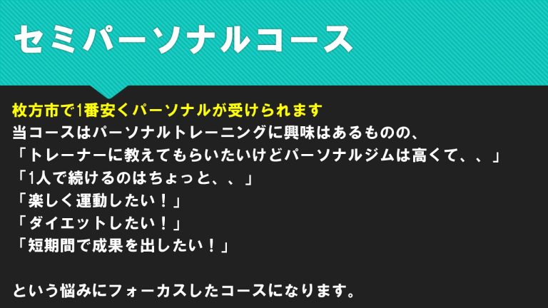 運動全くしてない方、安くでパーソナルを体験してみたい方、筋トレをしたいが何をしたらいいか分からない方などにオススメのコースです。