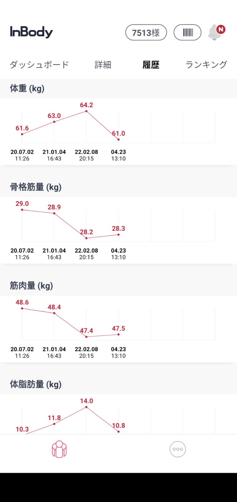 右肩上がりだった体重や体脂肪量がやっと下がりました(笑)