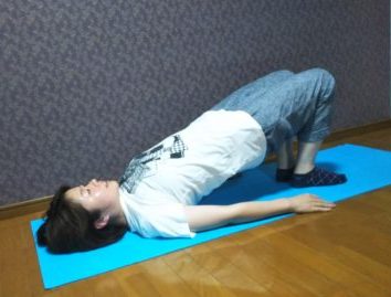 仰向けに寝た状態で両膝を立て、両足全体で地面を押すようにしてお尻を持ち上げます⤴