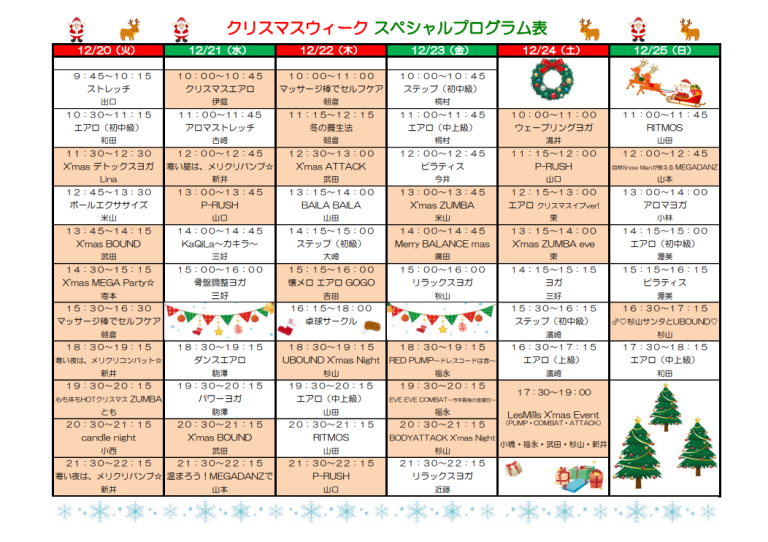 12月20日(火)~12月25日(日)クリスマスウィークとし、特別プログラムを行います✨