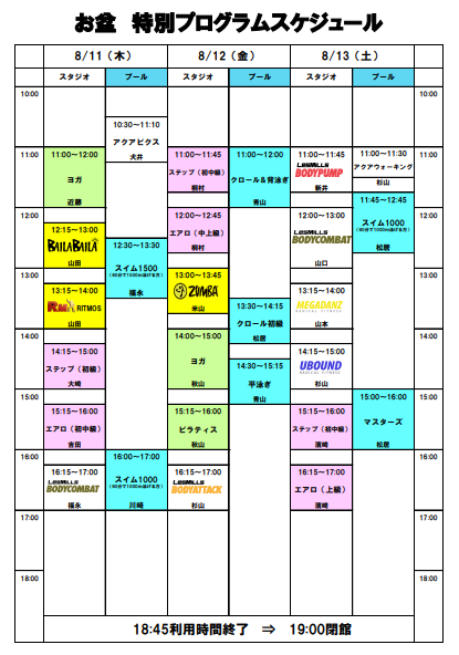 8/11(木)~8/13(土)の祝日特別プログラム表が完成しました✨