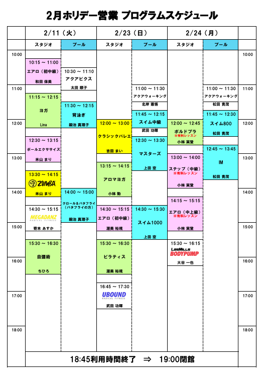 2月ホリデー営業 プログラムスケジュール2025.01.18