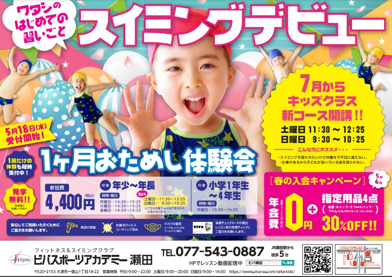 指定用品(スクールバック・水着・キャップ・アームヘルパーが30%)OFFでご入会して頂けます。