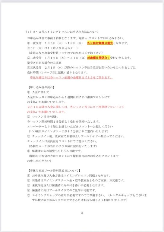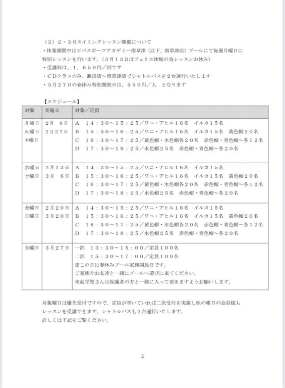 南草津店でのスイミングレッスンのご案内(2・3月)